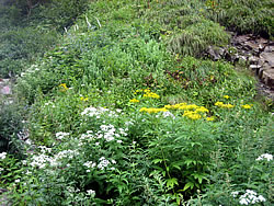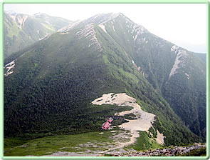 迷ったまま次の朝を迎えたら、なんと晴れていた。常念岳がくっきり見えている(写真@)。登らない理由がない。朝食でまた隣り合わせた老夫婦は、蝶ガ岳に行くことに決定したとのこと。朝食後、お水とカッパだけを入れた小ザックで身軽に出発(6:15)。 なだからかな砂礫の道を歩くと、すぐに前常念岳方向に行く標識が現れた(写真N)。その後ガレ地をジグザグに登るにつれて急登になっていく。そのうち大きなごつごつした岩になり、巨岩だらけの八合目手前をよじ登ると、ゆるやかな傾斜に出た。もうそろそろ頂上かと思っていたら頂上はさらに向こうにあった。 一ノ沢をめざして下山開始(9:30)。第三、第二、第一ベンチと樹林帯の中を下りていった後、川を渡り沢沿いを歩く(写真Q)。ここからは斜面にお花畑が続き、今にも雨が落ちそうな暗い周囲を明るくしてくれた。が、