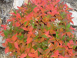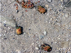 大天井岳を後にして(11:30)、進行方向に見える常念岳に向かって歩き始める(写真G)。広々した砂礫の稜線のところどころに群生しているタデ(オヤマソバ?)の葉がもう紅葉を始めている。ゆるやかな白い砂礫の斜面にオレンジ色や黄色に紅葉したタデの葉にお日様がさすと「きれい!」(写真H)。 このあと常念岳頂上に登ってくる時間はあったのだが、ガスで全く見えないのでやめることにした。内心少しほっとした。というのも、燕山荘からここまでの縦走が思ったより長かったので、この日はこれで終わりとしたかったからだ。 | ![]() G常念岳へ(H葉紅葉)