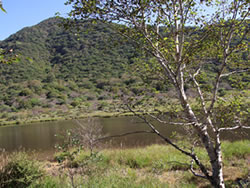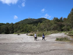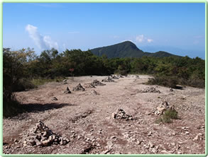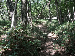 少しガレ場を下りると開けた場所になっていて、石積みが歩く方向に並んでいる。ここが賽の河原(写真左上)。 真正面に見える山は標高1572mの荒山(あらやま)(写真左上)。進行方向右側(北西)には電波塔のある地蔵岳(1674m)が見える(写真左上マウスオーバー)。 この後また林に入るが(10:30)開けた場所もあり、少しずつ標高を下げていくと小沼に到着(10:45)(写真左上から二番目)。青い空とそれを映す水面と白い砂浜がまぶしい。 しばらくは小沼に沿った遊歩道を歩くが、途中から砂浜に出て歩く。というかそもそもこのような広い砂浜があること自体が異常らしい(写真下)。 「前橋市の赤城山で、山頂エリアにある小沼の水位が、7月中旬頃から急激に低下している。標高1470メートルに位置する小沼は流入する河川はなく雨水が主な水源だ。この低下は、降水量の減少と猛暑が原因とみられる」とのこと。 小沼は8月の最初の時点で、「湖畔から水のあるところまで最大約40メートル干上がり、湖底にひび割れも発生。遊歩道を使わなくても1周できるほどになっている」 確かに9月の今でも湖の周囲には白い砂浜が見られるし、「長七郎山の山裾」近くの砂浜はかなり広い(写真下)。8月ほどではないかもしれないが、まだ水位はそれほど回復はしていないのかもしれない。 白い砂浜で広い空を見上げると雲の端に彩雲(光環?)を見つけた!吉兆の象徴と言われているので、この湖の水位も早く回復してほしい。 その後「長七郎山の山裾」から少し上り、関東ふれあいの道を長七郎山登山口の方へ歩く。途中で左側に黒檜山と駒ケ岳の麓に大沼が見えた(写真下)。右側には木々の間から小沼がほんの一部だが見える(写真下)。 長七郎山登山口まで来ると(11:15)元来た道で鳥居峠・覚満淵へ下りた。覚満淵では今度は北側を通って戻ってきた(写真左上から三番目)。 出口すぐ手前の木道からは、湖面に山や雲が水鏡のように映し出されていた(写真左一番下)。 ビジターセンターに戻ったあと、大沼の方に車で行き、「バンディ塩原」でワカサギ定食(写真下)をいただいて帰った(18年前は「見晴館」でワカサギ定食をいただいた)。 今回も昨年の榛名山登山の時と同様に、夜景のすばらしい「創造の森キャンプ場」にテントを張った(写真下)。2日目は夜通しずっと雨だった。 | ||||||||||||||||||||||||||||||