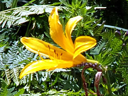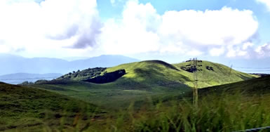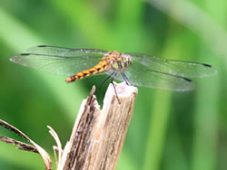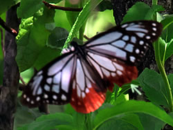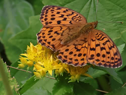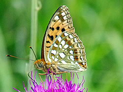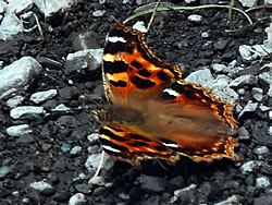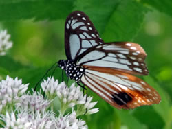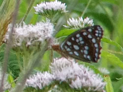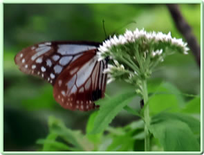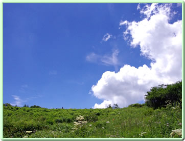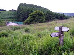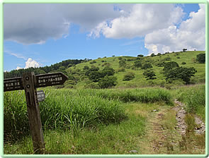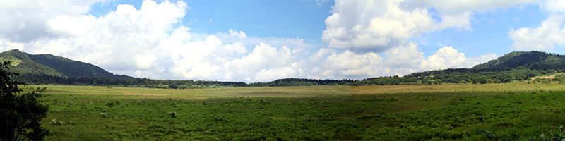 指標を左(ビジターセンター方面)に進む(写真下)。開けた場所に出ると、ハクサンフウロよりも大きく、色も濃いフウロを発見(写真下)。後で調べるとこれがアサマフウロ。確か前回の霧ヶ峰ハイキングでは見なかったと思う。 このエリアではニッコウキスゲやハナショウブなどもポツンポツンと見ることができる(写真下)。 左側に鎌ヶ池が見えてきた。青空にもくもくと湧いている入道雲が池にも映り、いかにも夏らしい風景(写真左上)。 午後からは天気が崩れるとの予報だったが、空は青色が一層増し、真っ白な入道雲と、一面緑の草原がまぶしい。この様子だとお天気はまだまだ大丈夫そうだ。 気温は27〜28度ぐらいらしいが、もちろん直射日光下では軽く30度を越えている暑さ(写真左真ん中)。ただ木道がたまに木陰に入るととても心地よい(写真左下)。そう思うのは人間だけではなさそうで、ここにもヒヨドリバナの蜜を気持ちよさそうに吸っているアサギマダラがいた(写真下)。 アサギマダラは、幼虫の食草「キジョラン」の多い高尾山では、たまに卵や幼虫も見つかったりするが、成虫はやはり、このような草原のヒヨドリバナが咲いているところの方が見つかりやすいようだ。個人的には黒い体に白い水玉模様がとても印象的なチョウ。 後からよく見ると、片方の羽の下部の茶色い箇所が少し切れてなくなっている!(写真下)というのもアサギマダラは数千キロも移動する、いわゆる旅をするチョウ。旅をする間にいろいろあっても不思議ではないかも。 八島ヶ池まで後200mのところまでやってきた。ここから鷲が峰に行く道も出ている。そしてようやく広場のところまで戻ってきたが、なんと13時になっていた。1時間半のところを2時間以上かけて歩いたことになるが、楽しい自然散策だった。 | ||||||||||||||||||||||||||||||||||||