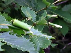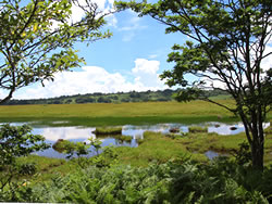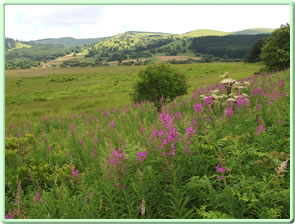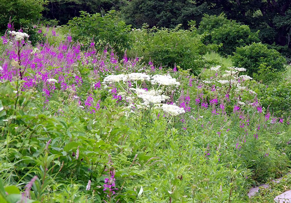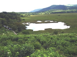足の指(3本)を骨折してから3カ月余り、まだ完璧な状態ではないが、ハイキングなら問題なさそうなので、なるべく涼しい標高の高い山へということで霧ヶ峰にやってきた。霧ヶ峰はこれが三度目(2000年、2005年)。なんと20年ぶり! ニッコウキスゲがかなり残っている車山肩は駐車場が満車だったが、霧ヶ峰にある湿原の一つ、八島ヶ原湿原(八島湿原)の駐車場にはぎりぎりで駐車できた。八島湿原(1630m)を含む霧ヶ峰の湿原は日本三代湿原(釧路湿原、尾瀬、霧ヶ峰)の一つ。この湿原を歩くのは初めて。 この湿原は高山植物の名所で今がまさに見頃。日本の高層湿原の南限で、学術的にも大変貴重なものだそうだ。左向きのハート型の形(ほぼ三角形)をしていて(湿原の形をした石:写真下)、その一辺の道を歩くのに約30分で通常は合計90分のコース。 駐車場の奥のビジターセンターのところを左に曲がって(10:45)小さなトンネルを越えて少し歩くと、湿原が見渡せる広場に出る。近くに八島ヶ池が、そして湿原の向こうに、ゼブラ山や物見石などの山々が見える(写真左上はもう少し下で撮影)。 この日は高校生500人が湿原を訪れているそうで、湿原に下りていく間に、さっそく数十人のグループとすれ違った。周囲はすでにお花の楽園。大型の花のシシウドは存在感が大きく、それ単独で景色の一部として絵になる存在だ(写真左上)。 湿原を一周する木道まで下りていくと半時計回りで歩くことにした。結果的には時計回りで歩く人の方が多かったようだ。木道の湿原側と丘側の両方の草原にお花が咲き乱れている。ホソバノキリンソウ、チダケサシやハナチダケサシ、アカバナシモツケソウ、ヒヨドリバナなどの各群生の中、ところどころにハクサンフウロ、ウツボグサ、ホタルブクロ、ノアザミなどの花が顔を出している(「お花畑に行く」を参照)。 木道がミズナラやノリウツギなどの林の中に入ると、ひんやりとした風が気持ちいい(写真左上から二番目)。ミズナラの葉っぱの多くにオトシブミが形成されている(写真下)。 林を出ると、緑の草原に赤い絨毯が敷かれている。ヤナギランの群生地だ(写真左下から二番目)。カメラマンたちが、その美しい景色をカメラの枠に収めようとスタンバイしてる。 再度、林の中に入った。さっそくヨツバヒヨドリの蜜を吸っているアサギマダラがいた(写真左下)。クガイソウやキバナノヤマオダマキ、カラマツソウなども発見。 鹿の防護柵(写真下)から一旦出て林を抜ける。この柵のおかげでいろんな植物に出会うことができていると思うと感謝しかない。しばらく歩くと、やっと「鎌ヶ池へ」の指標に到着(11:40)。この先130歩にある山小屋「ヒュッテみさやま」の看板が出ている(写真下)。 | |||||||||||||||||||||||||||||
