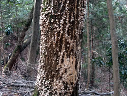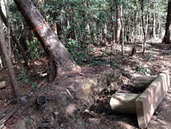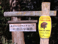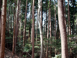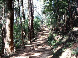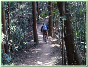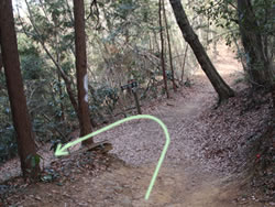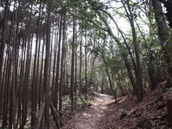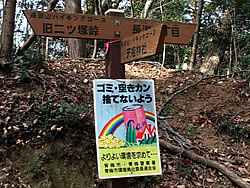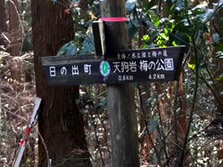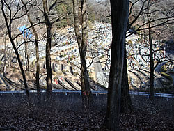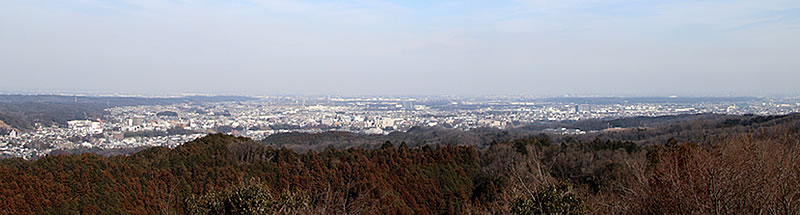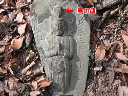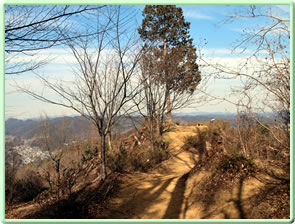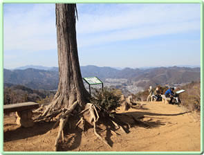 そのまままっすぐ天狗岩方面に進む。ここからは道が細くなり、黒いフェンス(二ツ塚処分場の立ち入り禁止フェンス)に沿って歩く。 途中、小さな馬頭観音の石像がある(写真下)(12:25)。左側が欠けていて良く見えないが「牛馬安全・大久野」とあり、安永3年(1774)の甲午(きのえうま)の年に立てられたそうだ。 観音様の頭の上にのっかっているのは、よく見るとわかるようにかわいい馬のお顔(だから馬頭)。青梅市にはこのような馬頭観音像が116体もあるらしい。それだけ青梅では生活に馬や牛が欠かせないものだったということだ。 山歩きの無事を祈ったら、さらに歩くこと10分ぐらいで、「天狗岩まで0.7km」の道標に従って北に進む。一旦日の当たる明るい場所に出たあと林の中に入っていき、緩やかな階段を上る(写真下)。現れた「赤ぼっこ」の道標に従い右へ行くと山頂に着いた(写真一番上)(12:45)。 この山頂はヒノキの木が一本立つ赤土の長細いスペース(写真左上と左真ん中)だが、パノラマビューを眺望できる特等席のような場所。北西側に奥多摩方面の山々が見え、東側は関東平野が広がっている(写真下パノラマ)。 今日は暖かいということもあって遠くは霞んでいて良く見えないのだが、ここからは青梅市街はもちろん東京のスカイツリー、筑波山まで見えるらしい(白く輝く西武ドームは見える)。でもこの標高でこのパノラマビューは素晴らしい。 このコースはあまりアップダウンもないので、マウンテンバイクで山頂まで来ている人もいた(写真下)。 山頂のちょうどいい陽だまりでお昼を食べ、眺望を十分に楽しんだら下山。元来た道を戻っていった(15:50駐車場着)。 | ||||||||||||||||||||||||||||||||||||