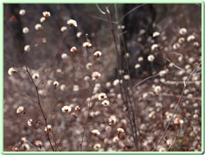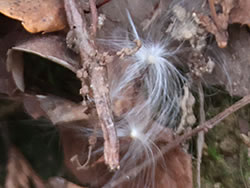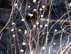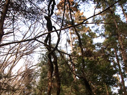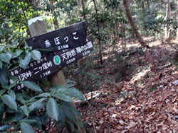 1923年に起きた関東大震災の際、表土が崩れ落ち赤土の露出した山となったことから「赤ぼっこ」と名付けられた山。今まであまり聞かなかった山の名前だが、ネットやSNSで知り、冬の低山歩きにぴったりなので暖かい小春日和の日を選んで陽だまりハイキングに行くことにした。 釜の淵公園駐車場(24時間無料)に車を停めて出発(10:20)。吉野街道(411号)に出て、31号線との交差点で南に曲がり、3つ目の交差点手前に天祖神社に着く(写真左上)(10:45)。 ここから260段の石段を上り山歩きの無事を祈ったら、神社の脇にある「長渕山ハイキングコース」の道標(写真下)に従ってスタート(10:55)。これからこの道標が長渕山ハイキングコースを案内してくれることになる。 階段をひと登りすると東屋があり、ここから林の中に入っていく。10分ほど歩くと次第に明るくなってきて尾根に出た。花のない冬の道にコウヤボウキの綿毛がちらほら見える。ピンク色の綿毛も。そのうち東側には「青梅市墓地公園」が木の間から見えてきた。 一旦車道に出て少し歩き、またすぐ登山道に入ると、綿毛のコウヤボウキの群生地があった(写真左下)(11:20)。そこには無数の白いぼんぼりが宙に浮かんでいた(写真下)。 | |||||||||||||||||||||||