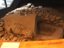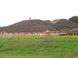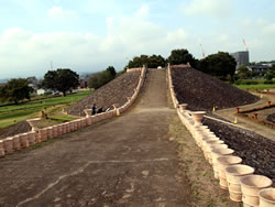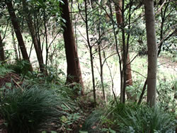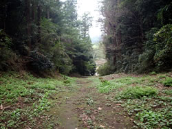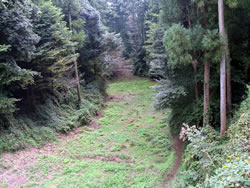 箕輪城のみどころは何といっても三の丸南側に位置する「大堀切」(大堀切:敵が侵入路として利用する可能性のある山の尾根などを切って設けた堀)。空堀ではなく、山の尾根を途中で断ち切るもの。 これまで訪れた数少ない中世のお城の中で、堀切の大きさを比較してみると、高天神城や春日城の堀切は小さいし、月山富田城の本丸と二の丸の間の大堀切はかつて幅10m、深さ約8mあったようだが、箕輪城の堀切は幅30m、深さ9mもあるので比べ物にならないぐらい大きい。それが虎韜(ことう)門までずっと続いていて城を南北に2分しているのだから、とんでもない大きさだ。 |