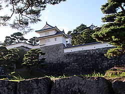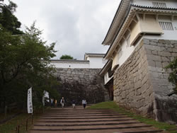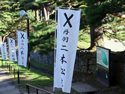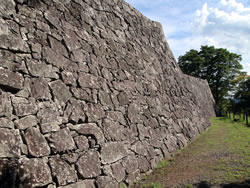 大壇口での戦いにおいて木村銃太郎隊長をはじめその多くが戦死し、戊辰戦争における悲劇のひとつとして知られている。 お城自体は、「二本松城」の名にふさわしく松の木が多く、箕輪門の前面には樹齢350年を超えるアカマツが連なっていて、箕輪門と附櫓(木造復元)や三の丸高石垣と良くマッチしている。お城に松の木は本当によく合うなと思った。 山上部の壮大な石垣も見ごたえがあった。また、安達太良山ビューポイントがいたるところにあり、単に二合田用水が安達太良山から引かれているというだけでなく、二本松の人たちにとって、心の拠りどころとなる山だったに違いない。 |