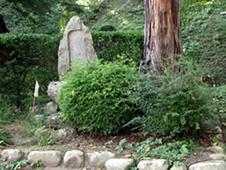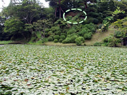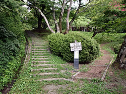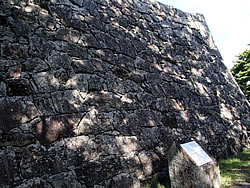 ←「二本松城に築かれた、最も古い石垣のひとつ。築石は野面石と荒割石が用いられ、その積み方は「穴太積み」。大小の石材をレンガをねかせるように横積みし、数石しか「横目地」の通らない、いわゆる「布積み崩し」の積み方。二本松城が会津領の支城となった慶長初期頃、蒲生氏郷に抱えられた城郭石積み技術者集団「穴太衆」によって築かれた石垣」 実際、草が生えていてはっきりわからなかった。 |