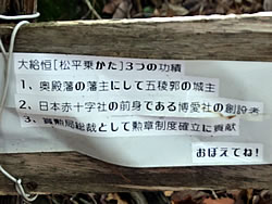 ←であいの館:あいにくこの日は火曜日で休館日。続100名城のスタンプは外に出ているので大丈夫だが、中には入れないのは残念。 松平乗謨(まつだいらのりかた):龍岡城を築城し、江戸幕府の老中格、老中、若年寄をつとめ、日本赤十字社の前身である博愛社の創設者のひとりとして知られる。明治維新後に改名して大給恒(おぎゅうゆずる)となる。→ |