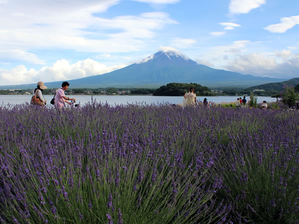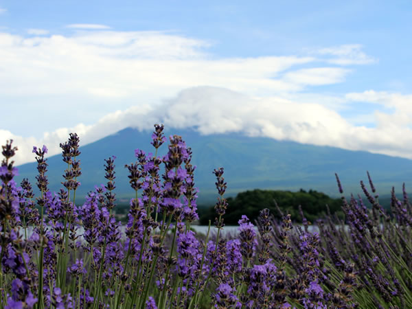 ラベンダーと雲の帽子をかぶった富士山