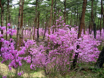 鳴沢道の駅の見事なミツバツツジ