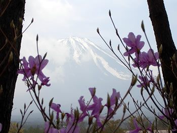 鳴沢道の駅のミツバツツジと富士山