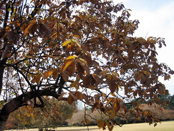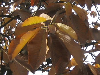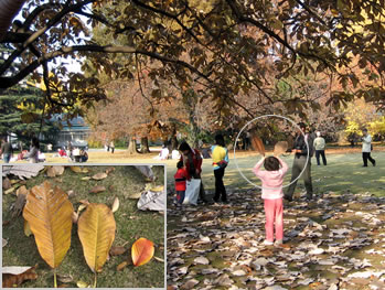 (女の子が大きなホウノキの葉をウサギの耳のようにしています)